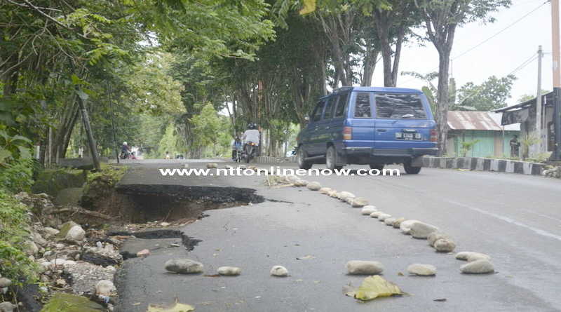 Atambua, NTTOnlinenow.com – Pasca hujan yang mengguyur wilayah Belu dalam sepekan terakhir mengakibatkan sebagian fasilitas umum rusak, seperti bagian ruas jalan pada dua jalur Eltari menuju Kantor Bupati Belu terancam putus.