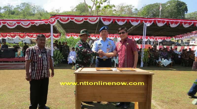 Atambua, NTTOninenow.com – Danlanud Eltari Kupang, Kolonel PNB Roni I Moningka bertindak sebagai inspektur upacara penutupan TMMD ke-100 yang berlangsung di lapangan Kantor Camat Lasiolat, Kabupaten Belu, Timor Barat perbatasan RI-Timor Leste, Kamis (26/10/2017).