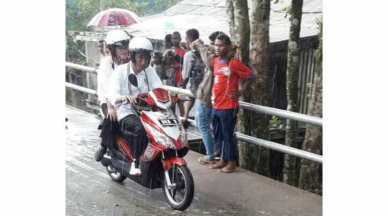 Presiden pun memboncengi Ibu Iriana dengan motor listrik berwarna merah menuju Aula Wiyata Mandala, Dinas Pendidikan Kabupaten Asmat yang berjarak 2,8 kilometer.