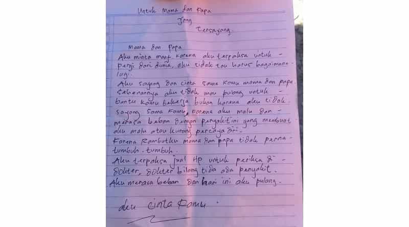 Surat tersebut di tujukan kepada kedua orang tuannya di kampung halamannya. Demikian kutipan isi suratnya, “untuk Mama dan Papa yang tersayang. Mama dan Papa, aku minta maaf karena aku terpaksa pergi dari dunia, aku tidak tau harus bagaimana lagi. Aku sayang dan cinta sama kamu mama dan papa. Sebenarnya aku tidak mau pulang untuk bantu kamu bekerja bukan karena kau tidak sayang sama kamu, karena aku malu dan merasa beban dengan peyakit yang membuat aku malu atau kurang percaya diri. Karena rambutku mama dan papa tidak pernah tumbuh-tumbuh. Aku terpaksa jual Hp untuk periksa di dokter, dokter bilang tidak ada penyakit. Aku merasa beban dan hari ini aku pulang. Aku cinta kamu”.