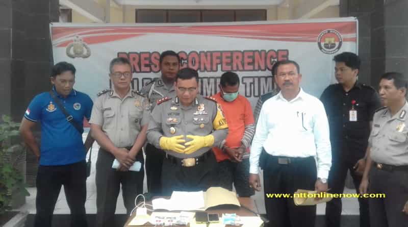Kapolres Sumba Timur AKBP Victor MT Silalahi saat menggelar jumpa pers Selasa (19/6/2018), kepada wartawan mengatakan, penangkapan oknum YTA alias J di salah satu Hotel sedang bertransaksi narkotika saat itu anggota Sat. Narkoba langsung menangkap oknum YTA alias J.