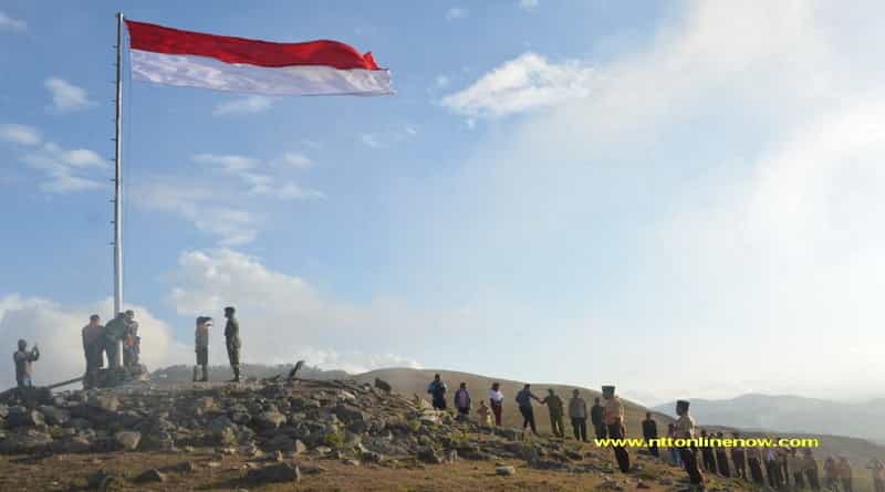 Bendera Merah Putih Raksana berukuran 7×3 (panjang 7 meter dan lebar 3 meter) dikibarkan di puncak Hol Jab, Fohuk, Piebulak, Desa Lo’oluna perbatasan Kecamatan Laksel dengan Timor Leste, Selasa (14/8/2108) sore pukul 16.30 Wita.