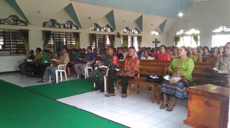 Kalabahi, NTTOnlinenow.com – Untuk menumbuhkan semangat kebersamaan dan jiwa gotong royong TNI dan masyarakat dilokasi sasaran pelaksanaan Tentara Manunggal Membangun Desa (TMMD) ke 105 di wilayah Kodim 1622/Alor, anggota Babinsa Koramil 1622-01/Kalabahi melaksanakan komunikasi sosial (Komsos) bersama warga, Minggu (30/6/2019) bertepat di Gereja Ebenheser Desa Pailelang Kecamatan Alor Barat Daya Kabupaten Alor Prov. NTT.