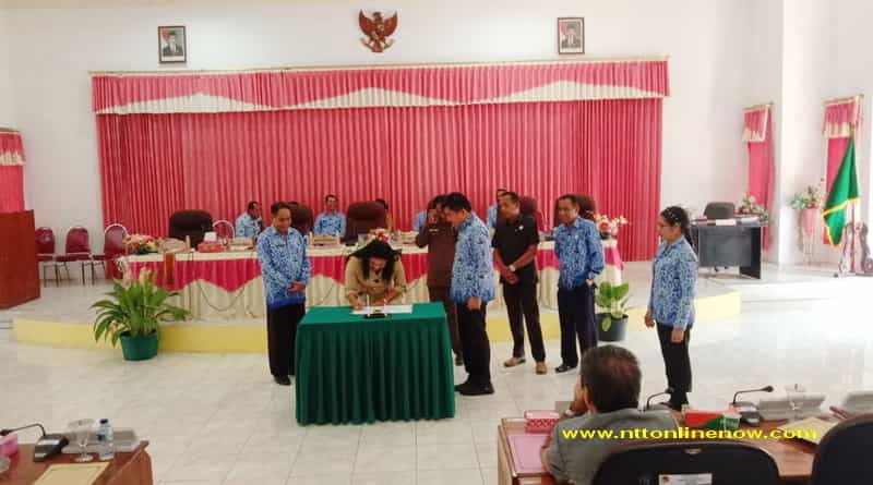 Selesai penyampaian pendapat akhir fraksi, dilanjutkan dengan penandatanganan pengesahan Ranperda menjadi Perda oleh Bupati Belu Willy Lay bersama Ketua DPRD Januaria Awalde Berek disaksikan oleh semua anggota legislatif dan Pimpinan OPD.