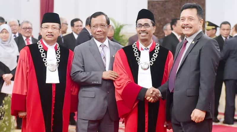 Jakarta, NTTOnlinenow.com – Presiden Joko Widodo menyaksikan pengucapan sumpah calon hakim konstitusi Daniel Yusmic Pancastaki Foekh dan Suhartoyo sebagai hakim konstitusi di Istana Negara, Jakarta, pada Selasa, 7 Januari 2020. Keduanya akan bertugas di Mahkamah Konstitusi (MK) untuk periode 2020 hingga 2025 mendatang.