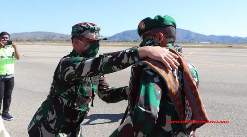 Danrem Kol. Samuel didampingi Ketua Persit KCK Korem 161/WS bersama rombongan gunakan pesawat dari Kupang tiba di bandara A. A Bere disambut oleh Dandim 1605/Belu, Letkol Inf. Ari Dwi Nugroho dengan pengalungan kain tais lanjut hasei hawaka.