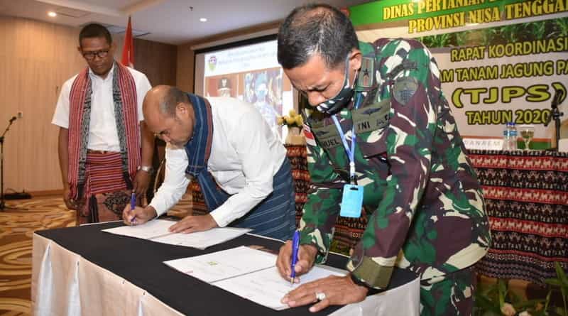 Penandatanganan Perjanjian Kerjasama (MoU) Pengembangan Pertanian Terintegrasi ini antara Kepala Dinas Pertanian Provinsi NTT selaku Kuasa Pengguna Anggaran (KPA) dengan Danrem 161/Wira Sakti dan Kepala Dinas Pertanian Kabupaten/Kota selaku Pejabat Pembuat Komitmen (PPK) dengan Danrem 161/Wira Sakti selaku Kepala Pelaksana Kegiatan (Kalakgiat) Pendampingan Kegiatan TJPS.