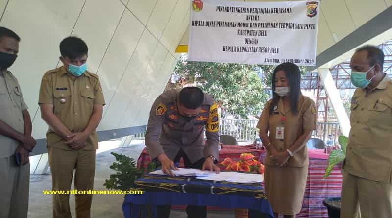 Hal itu ditandai dengan penandatanganan perjanjian kerjasama oleh Kepala Dinas Penanaman Modal dan Pelayanan Terpadu Satu Pintu Belu, Fahik dan Kapolres Belu, AKBP Khairul Saleh di lantai II Coffe Lakmaras, Selasa (15/9/2020).