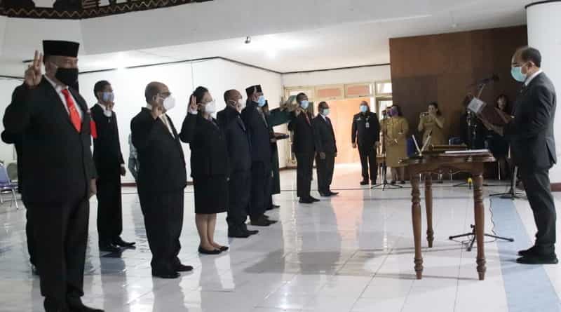 Kupang, NTTOnlinenow.com – Wali Kota Kupang, Dr. Jefirstson R. Riwu Kore, MM, MH mengambil sumpah dan melantik 11 orang yaitu pejabat pimpinan tinggi pratama dan pejabat fungsional pengelola barang dan jasa pemerintah di lingkungan Pemerintah Kota Kupang. Pelantikan berlangsung di lantai 1 Kantor Walikota Kupang, Senin (21/12) siang. Pelantikan ini juga dihadiri dan disaksikan Wakil Wali Kota Kupang, dr. Hermanus Man, Ketua DPRD Kota Kupang, Yeskiel Loudoue, S.Sos., Sekda Kota Kupang, Fahrensy P. Funay, S.E., M.Si., Kajari Kota Kupang, Oder Max Sombu, S.H., Kasdim Kodim 1604 Kupang, Letkol Inf, Sugeng Prihatin, S.Sos., M.Sc., M.Tr., serta Pimpinan perangkat daerah lingkup Pemerintah Kota Kupang.