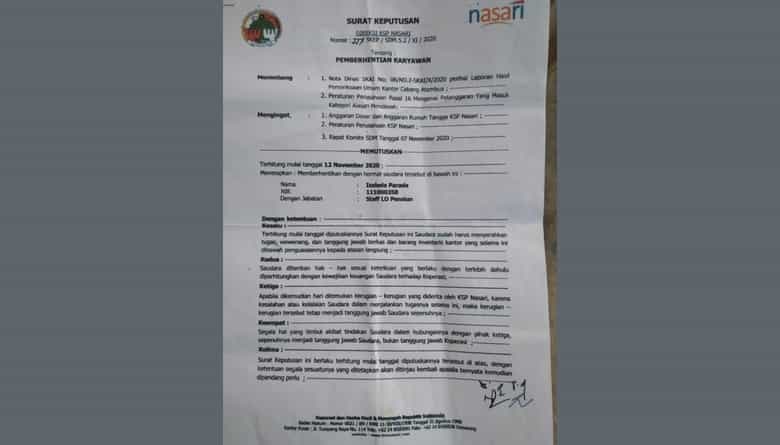 IS karyawan KSP Nasari kepada wartawan mengatakan dirinya diberhentikan atau PHK dari karyawan KSP Nasari Atambua sejak November 2020 lalu.