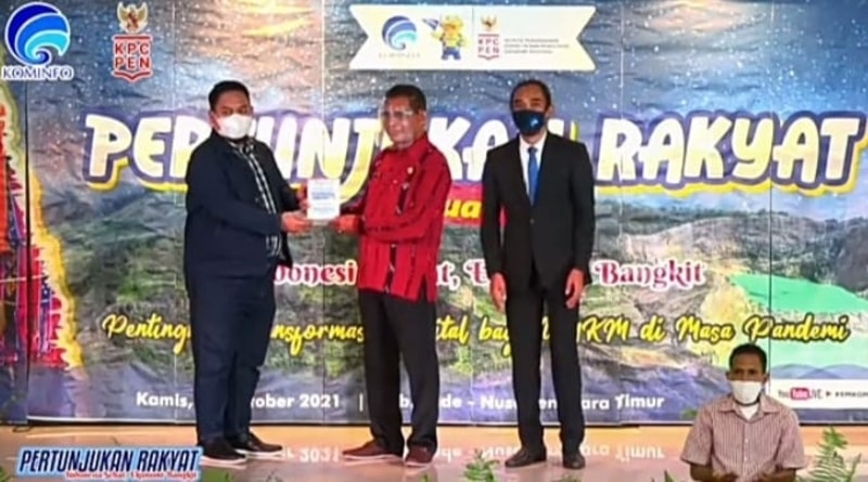 Foto : Panitia kegiatan Pertunjukan Rakyat Virtual Indonesia Sehat Ekonomi Bangkit, Bobby Ciputra, S.I.P saat menyerahkan plakat penghargaan kepada Pemda Kabupaten Ende yang diterima oleh Asisten III Bidang Administrasi Setda Kabupaten Ende, Hiparkus Hepi,SE, pada kegiatan Pertunjukan Rakyat Virtual Indonesia Sehat Ekonomi Bangkit, bertempat di Hotel Syifa Ende, Kamis (28/10/2021). Dokumentasi : YouTube (Kemkominfo TV)