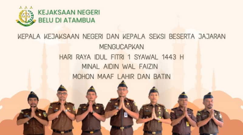 Headline 30/04/2022 alex Bagikan Artikel iniKEPALA KEJAKSAAN NEGERI DAN KEPALA SEKSI BESERTA JAJARANNYA MENGUCAPKAN SELAMAT HARI RAYA IDUL FITRI 1443 H/2022 MOHON MAAF LAHIR DAN BATIN