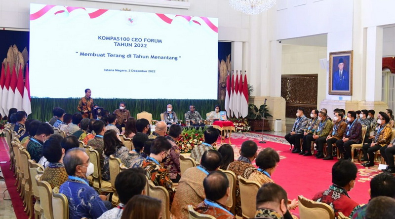 “Bagaimana membangun sebuah ekosistem besar sehingga negara lain tergantung pada kita karena kita memiliki nikel, memiliki tembaga, memiliki bauksit, memiliki timah, dan potensi kita ini gede sekali,” ujar Presiden Joko Widodo saat menyampaikan pidato kunci pada acara Kompas100 CEO Forum Tahun 2022 yang digelar di Istana Negara, Jakarta, pada Jumat, 2 Desember 2022.