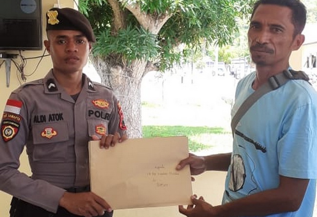 Foto : Yanuarius Tae, menyerahkan surat keberatan ke Polres Malaka, diterima Bripda Markus A. Raja.