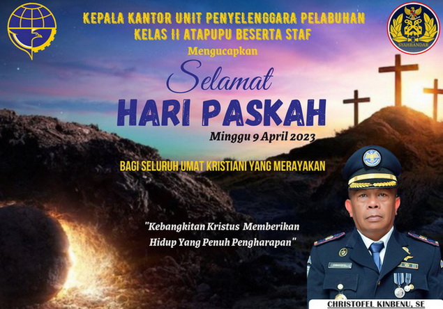 Headline 08/04/202308/04/2023 alex Bagikan Artikel iniKEPALA KANTOR UNIT PENYELENGGARA PELABUHAN KELAS II ATAPUPU BESERTA STAF MENGUCAPKAN SELAMAT HARI PASKAH BAGI SELURUH UMAT KRISTIANI YANG MERAYAKAN