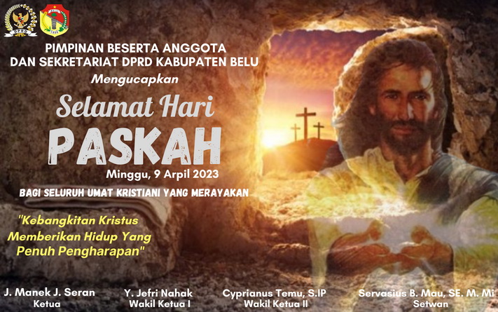 Headline 09/04/202309/04/2023 alex Bagikan Artikel iniPIMPINAN BESERTA ANGGOTA DAN SEKRETARIAT DPRD KABUPATEN BELU MENGUCAPKAN SELAMAT HARI PASKAH
