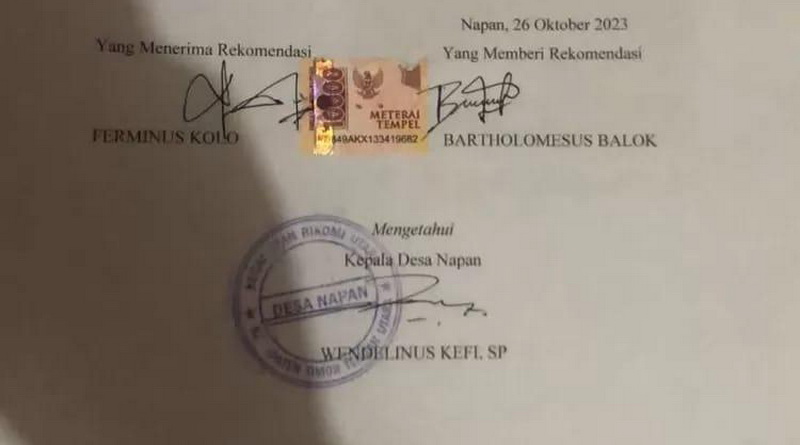 Ironisnya lagi, surat rekomendasi yang dibuat oleh sang kepala desa itu dibubuhi materai 10.000 dan seolah-olah ditandatangani oleh Bartholomeus.